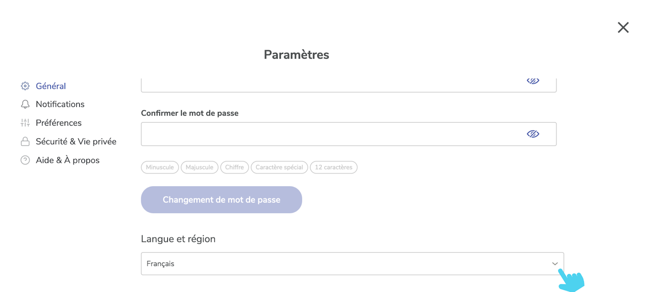 - Cliquer sur le menu déroulant « Langue »