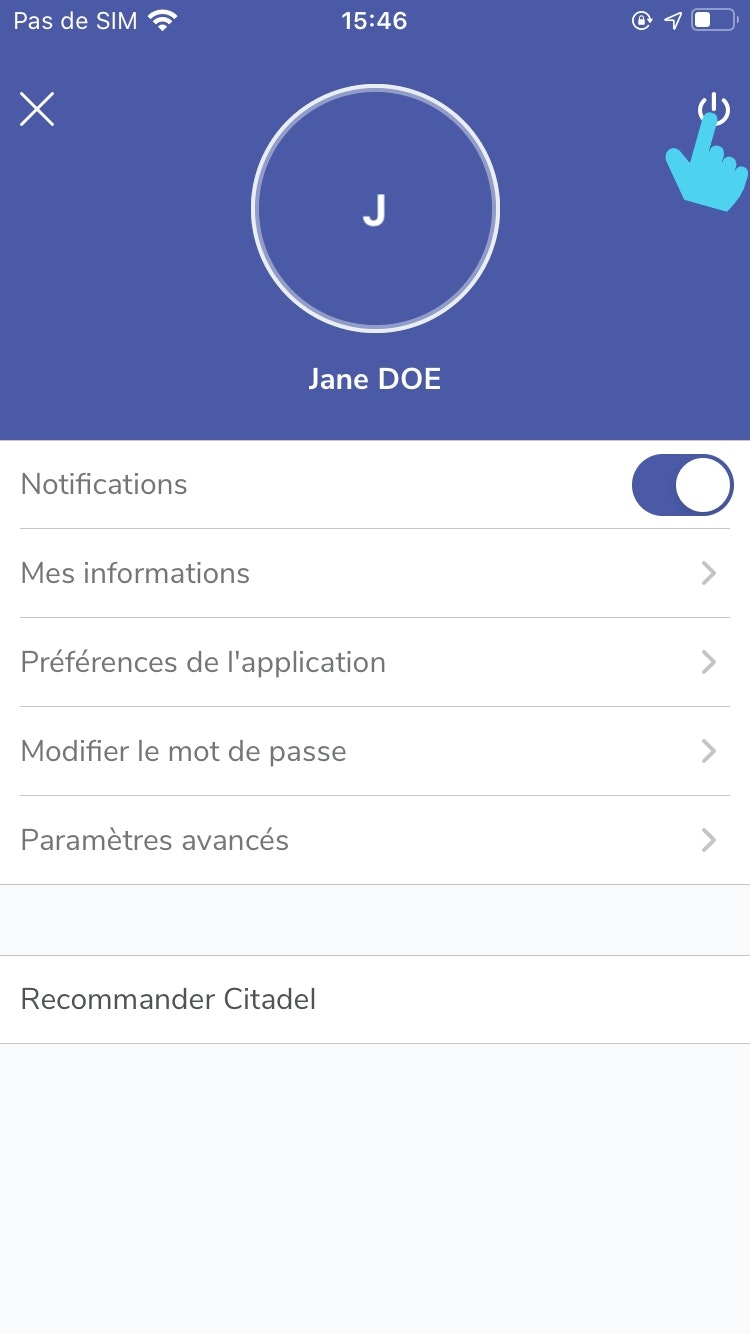 - Cliquer sur l’icône déconnexion en haut à droite de l’écran